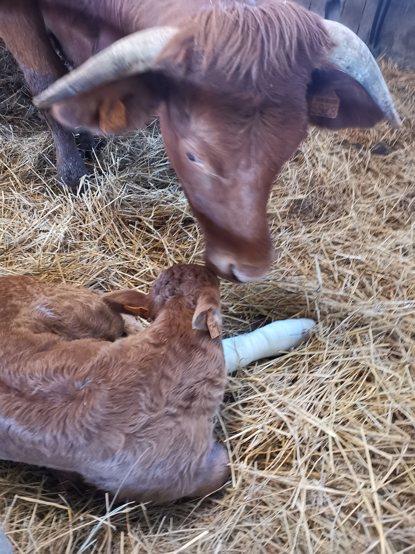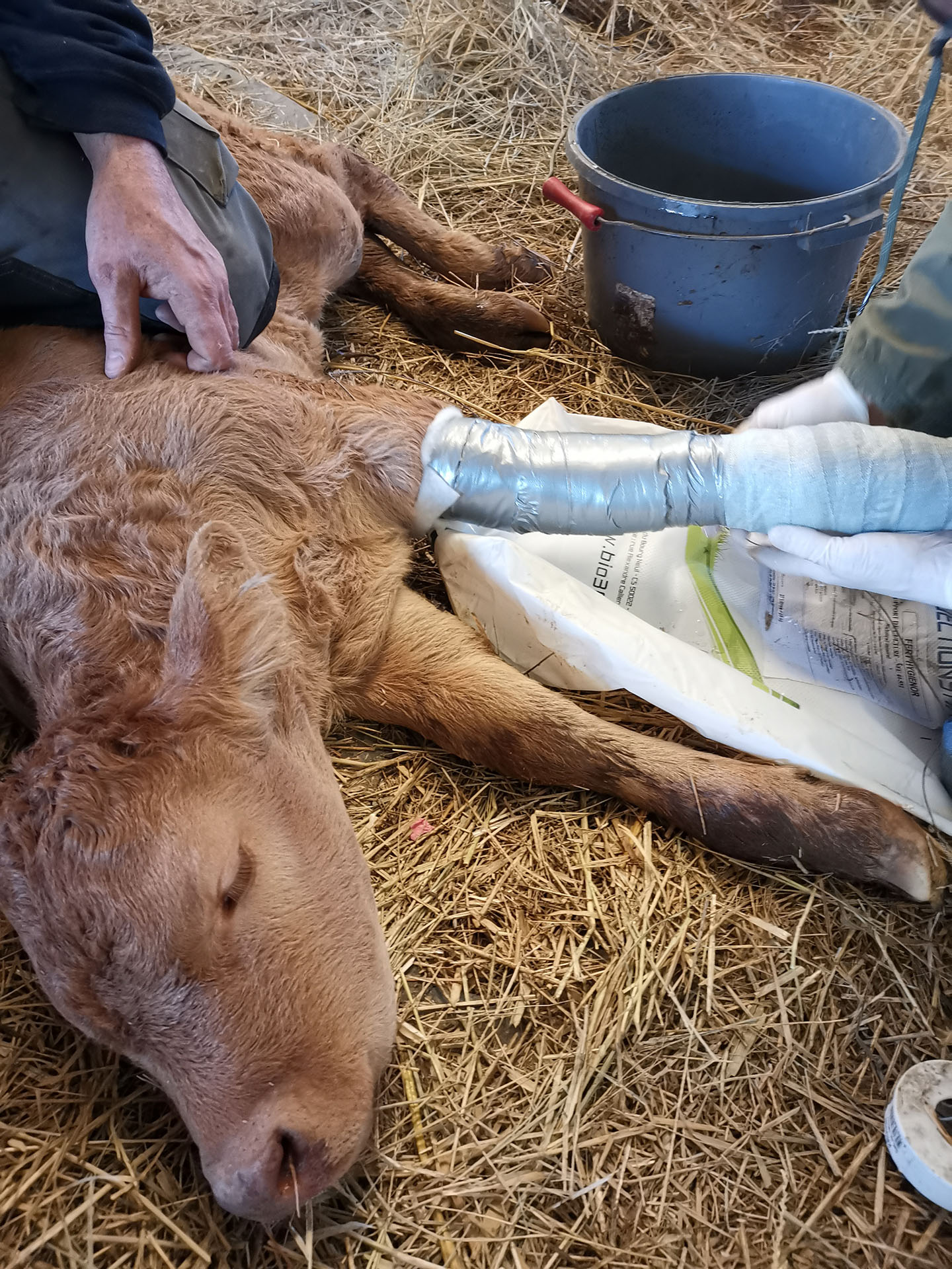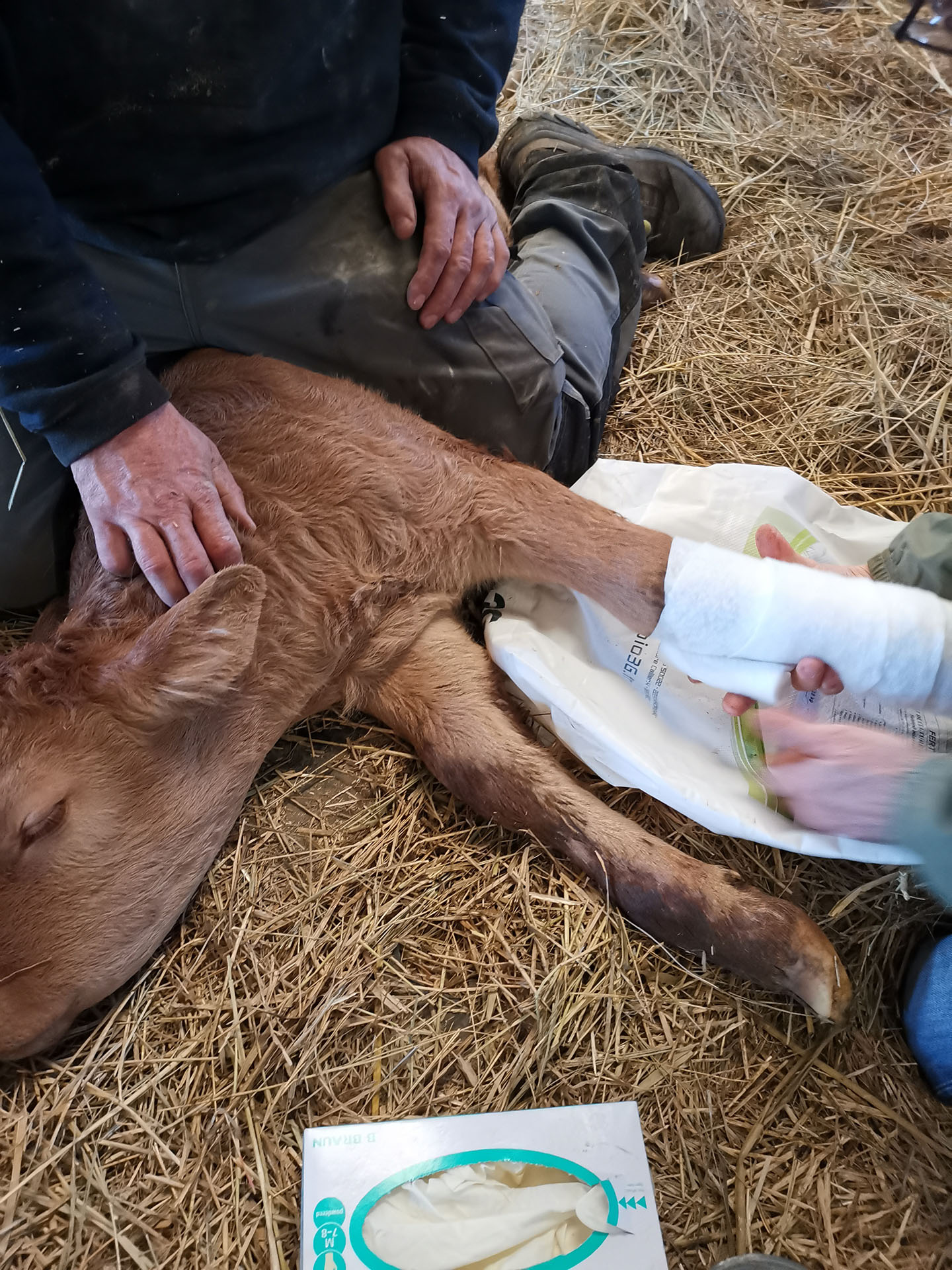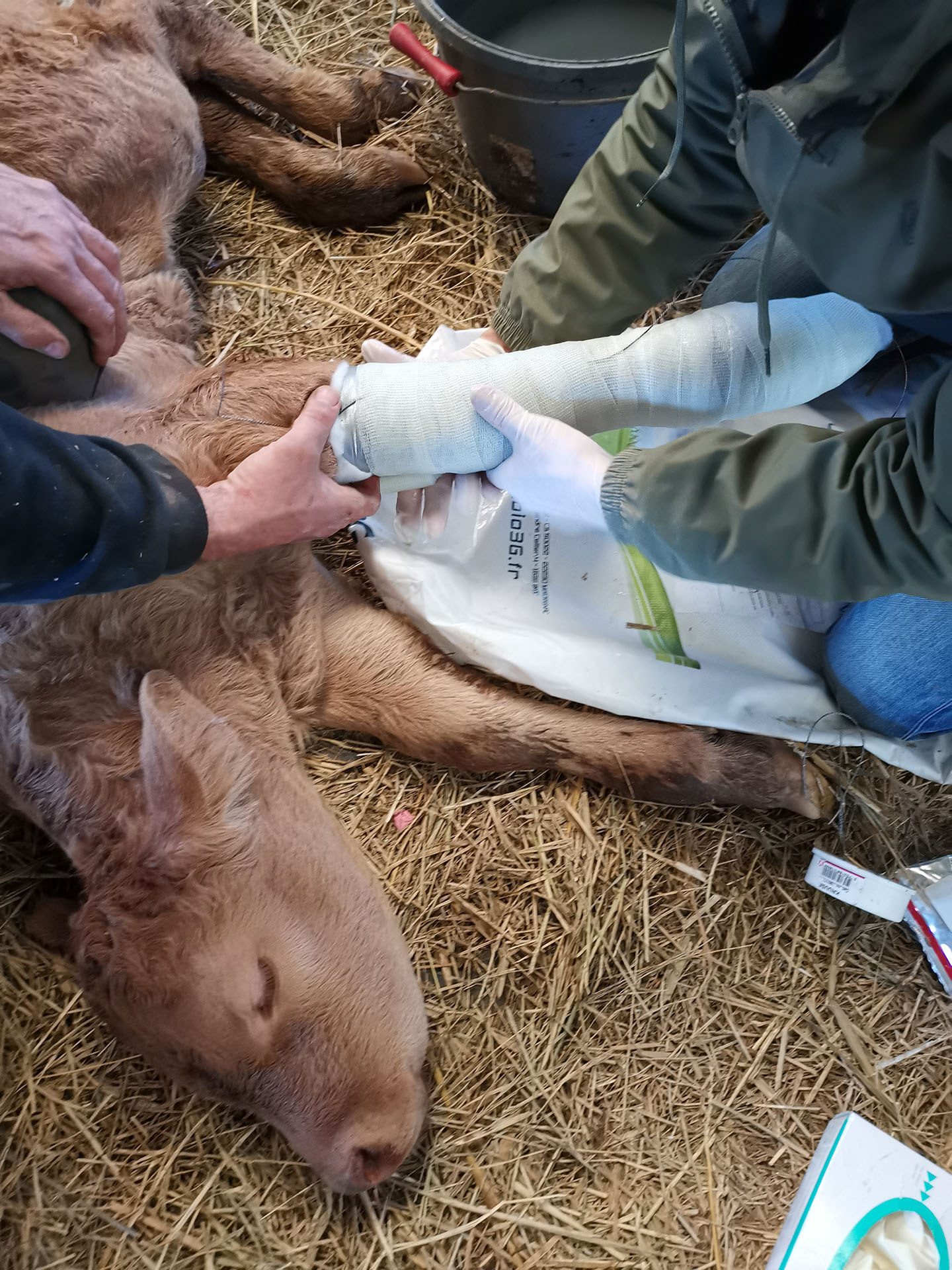 Parfois, les veaux se blessent et lorsque nous ne pouvons rien faire tout seul, nous appelons un vétérinaire. Ici un veau s’est cassé une patte dans les passages veaux. Il a du être plâtré pendant 4 semaines. Rassurez-vous, à présent il court et saute comme ses copains.